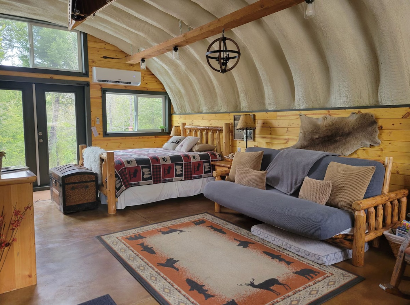 The first thing you notice is that iconic silver, half-cylinder shape. It’s striking against the dark green forest backdrop. But once you step inside, the “metal shed” feel disappears. Because of those high, curved ceilings, the 750 square feet feels way bigger than it sounds.