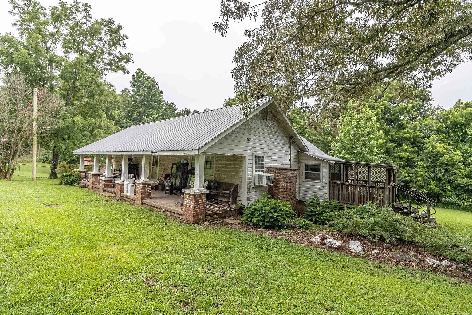 The interior offers a large eat-in kitchen that supports daily meals and gatherings. Nearby, the living room provides ample space for relaxing evenings and conversation. A wide front porch encourages morning coffee and evening views of the land. Meanwhile, a screened side porch creates a shaded outdoor retreat. Because both porches extend usable space, owners enjoy flexible living throughout warmer months. Consequently, the home supports a slower, more intentional lifestyle.