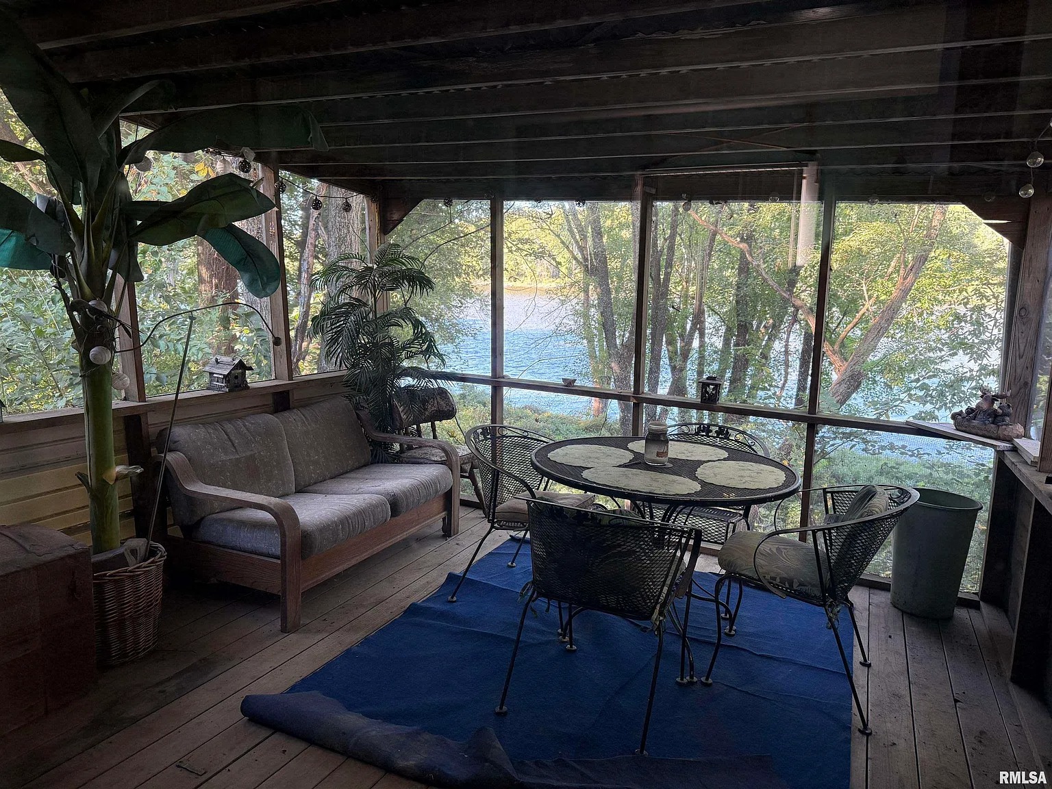 The screened porch allows visitors to enjoy the river scenery while remaining protected from insects. In river environments, porches like this often become the primary gathering space.