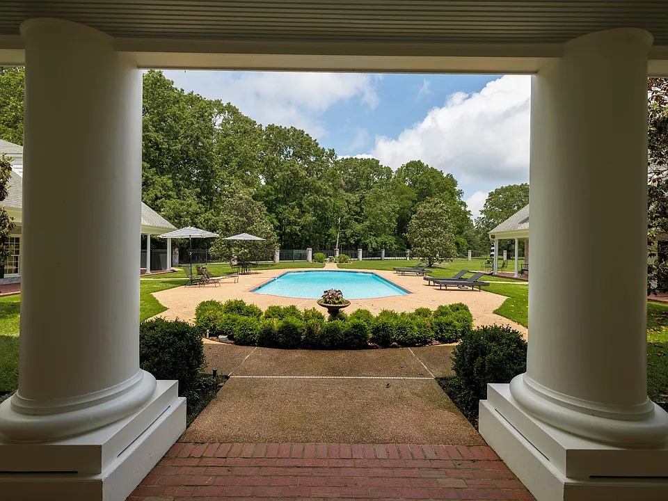 The lower porch connects directly to a gunite pool area designed for relaxation and gatherings. A spiral staircase also links the upper porch to poolside living. Nearby, a three-car detached garage and a sixteen-hundred-square-foot pool house frame the space. The pool house includes a full bar and living area below. Upstairs, a billiards room supports evening entertainment. Therefore, leisure spaces encourage hosting without disrupting private residence areas.