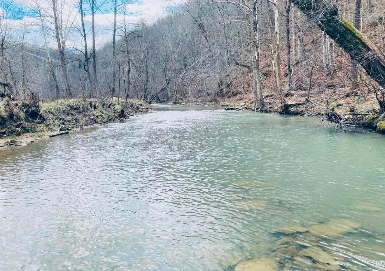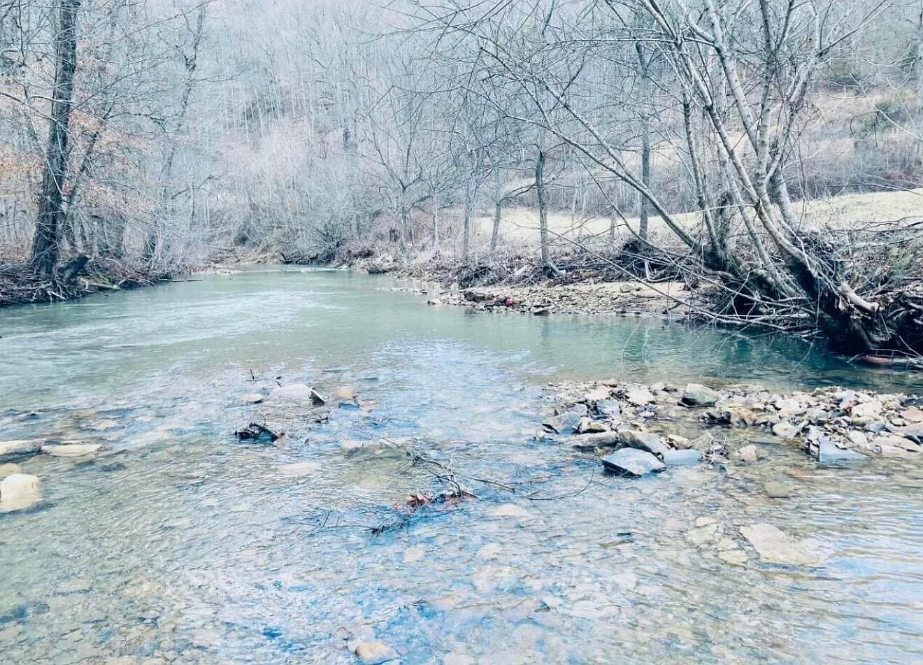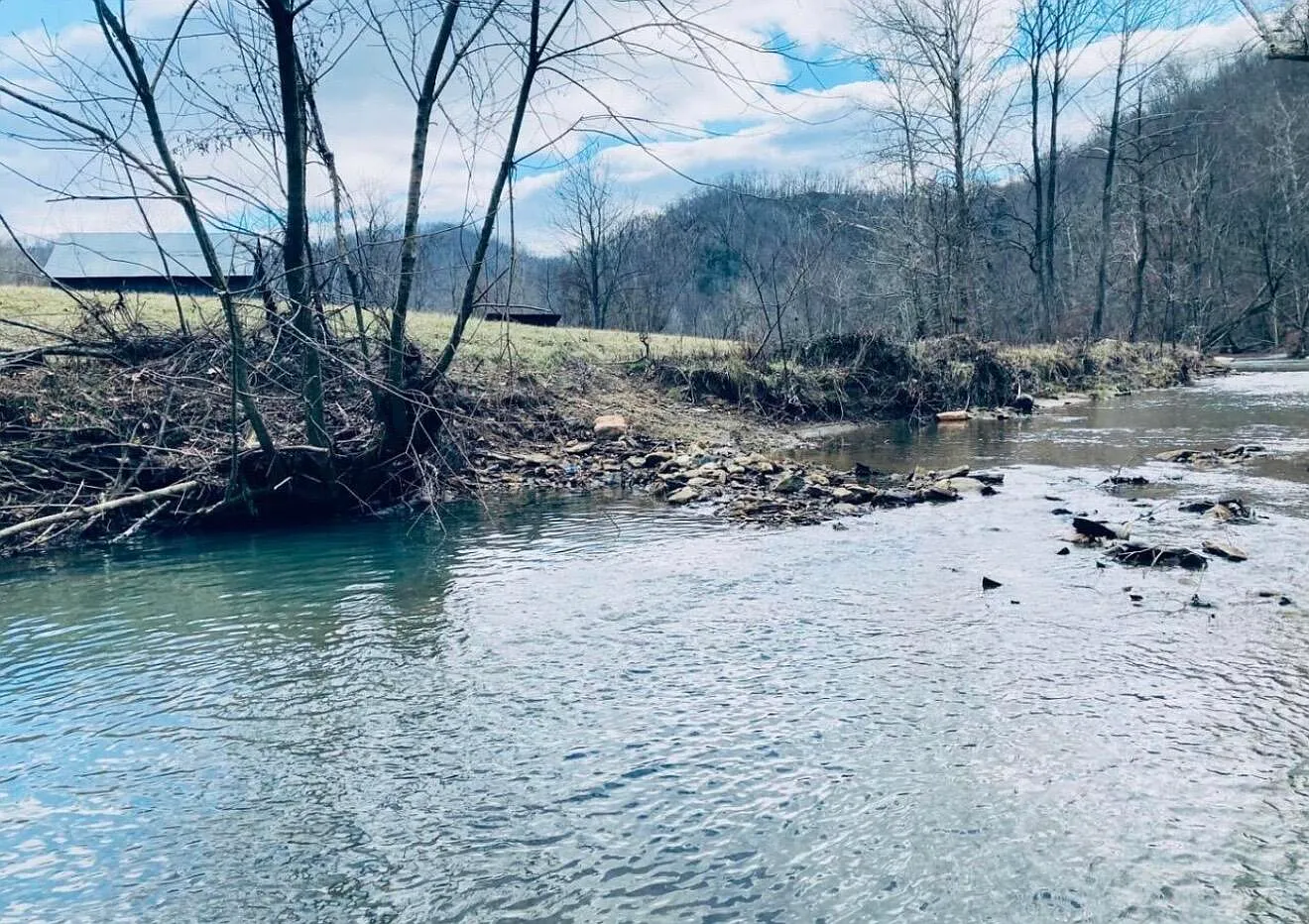 The acreage includes both cleared bottomland and wooded hills, which creates a balanced mix of uses. The open areas are already used for hay and could also support livestock. Meanwhile, the wooded sections provide space for hunting or trail use. A small creek runs near the back, which adds a natural water feature. Because of the varied terrain, the land may suit both agricultural and recreational needs.