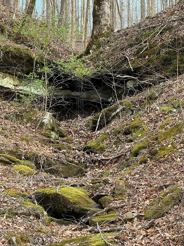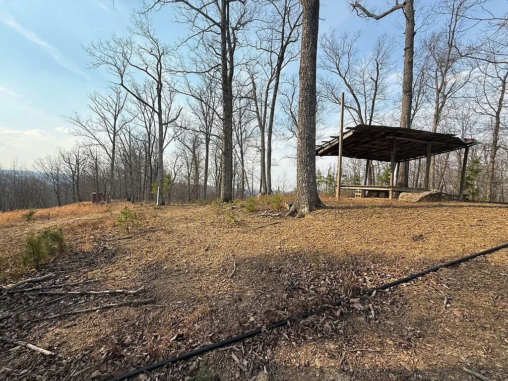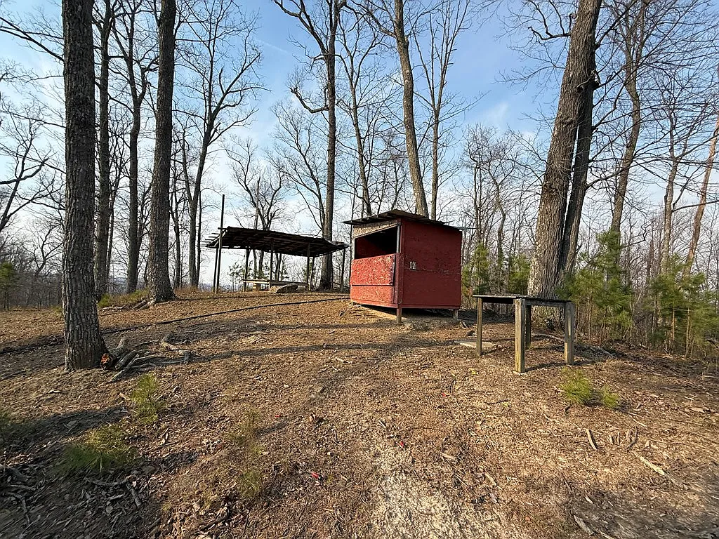 The land also includes waterfalls and rock formations, which add variety to the landscape. There is a gazebo positioned for sunset views, which may be useful for relaxation. A hunting blind is already in place, which may appeal to some buyers. Overall, there is enough land here for multiple outdoor uses.