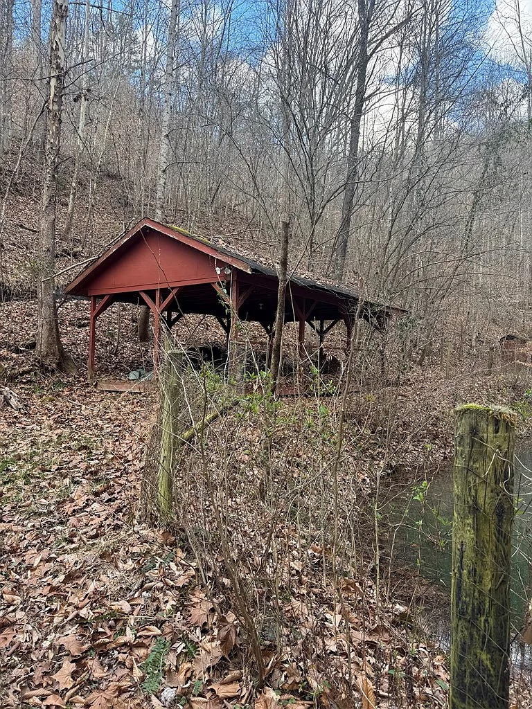 Some sections appear suited for hiking or riding small off-road vehicles. The property also includes a small pond and a picnic shelter.