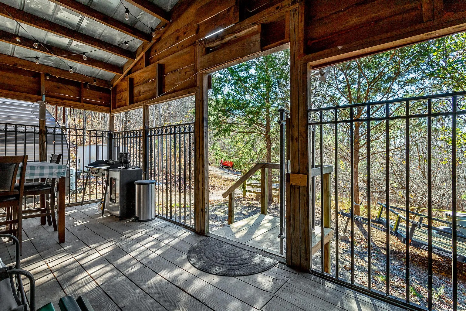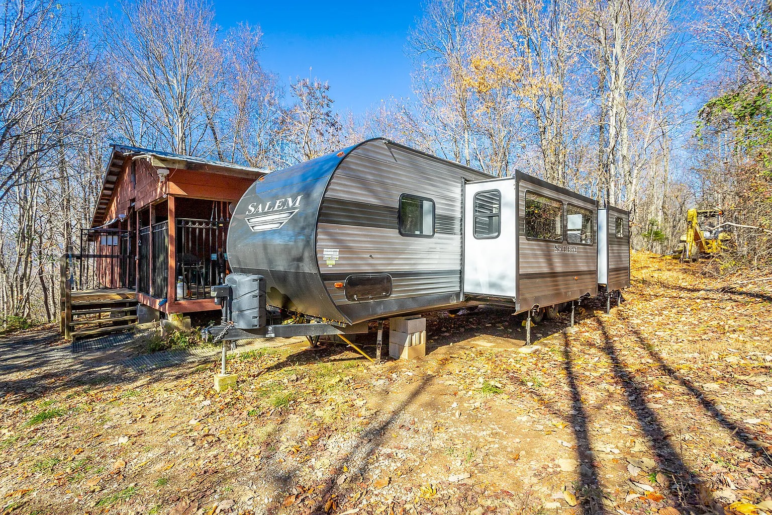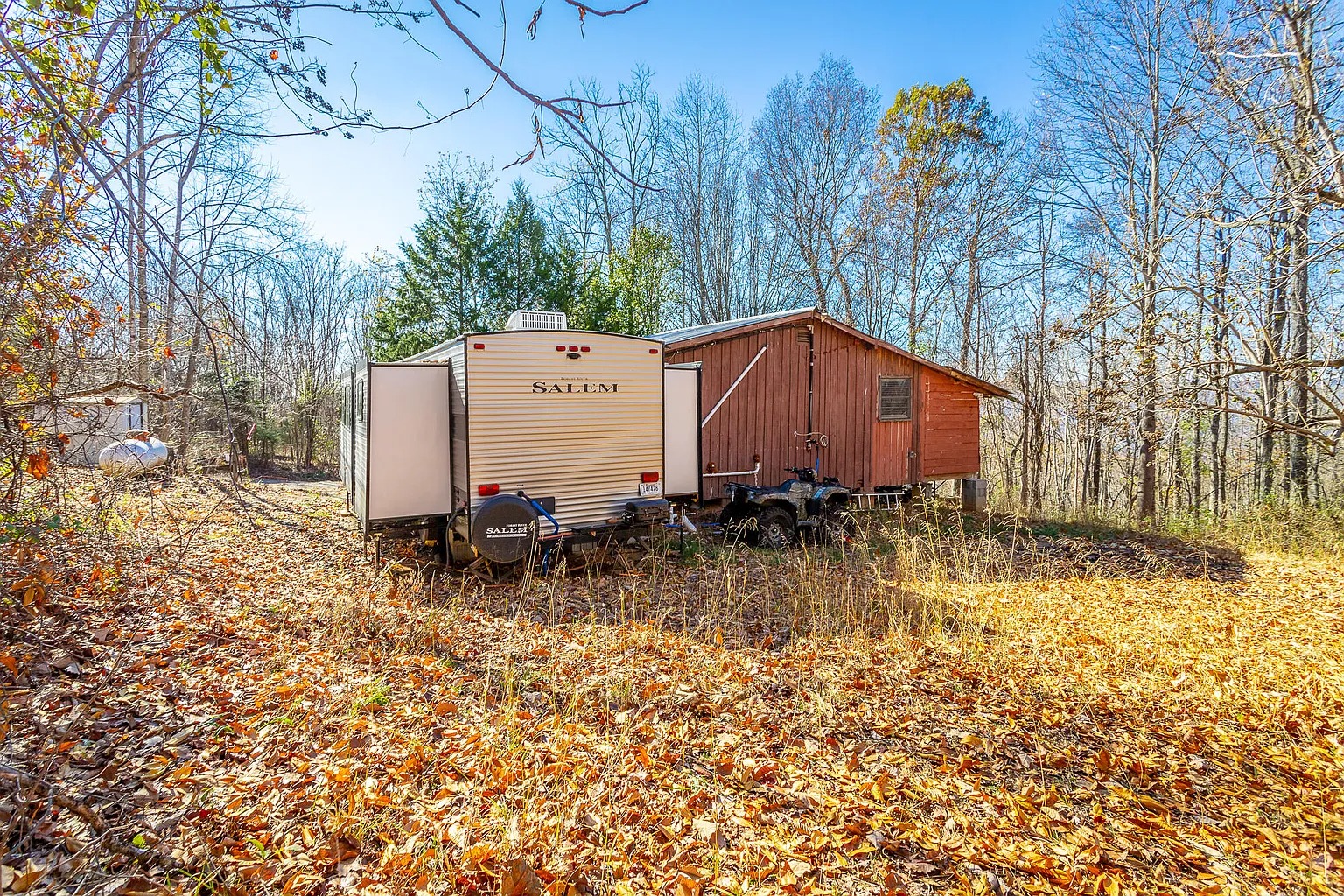 A 768 square foot cabin sits on the property and includes partial furnishings. Nearby, a newer travel trailer connects to the cabin through a dedicated deck. The sale includes a tri-fuel generator that powers the camper reliably. A well, septic system, and propane tank already support on-site living. Therefore, owners avoid immediate infrastructure planning and focus on use. Because utilities remain established, weekend stays or extended visits start quickly.