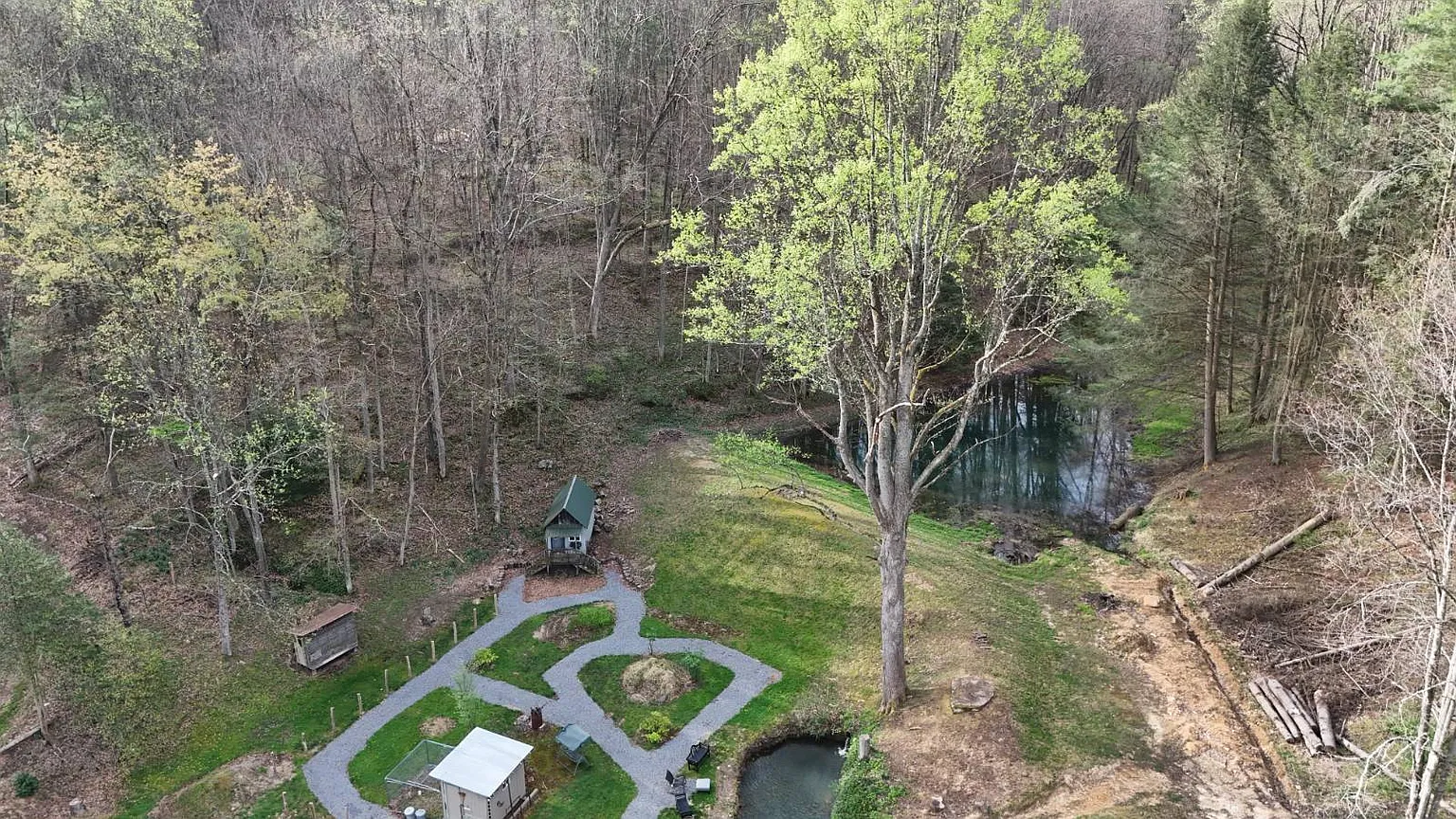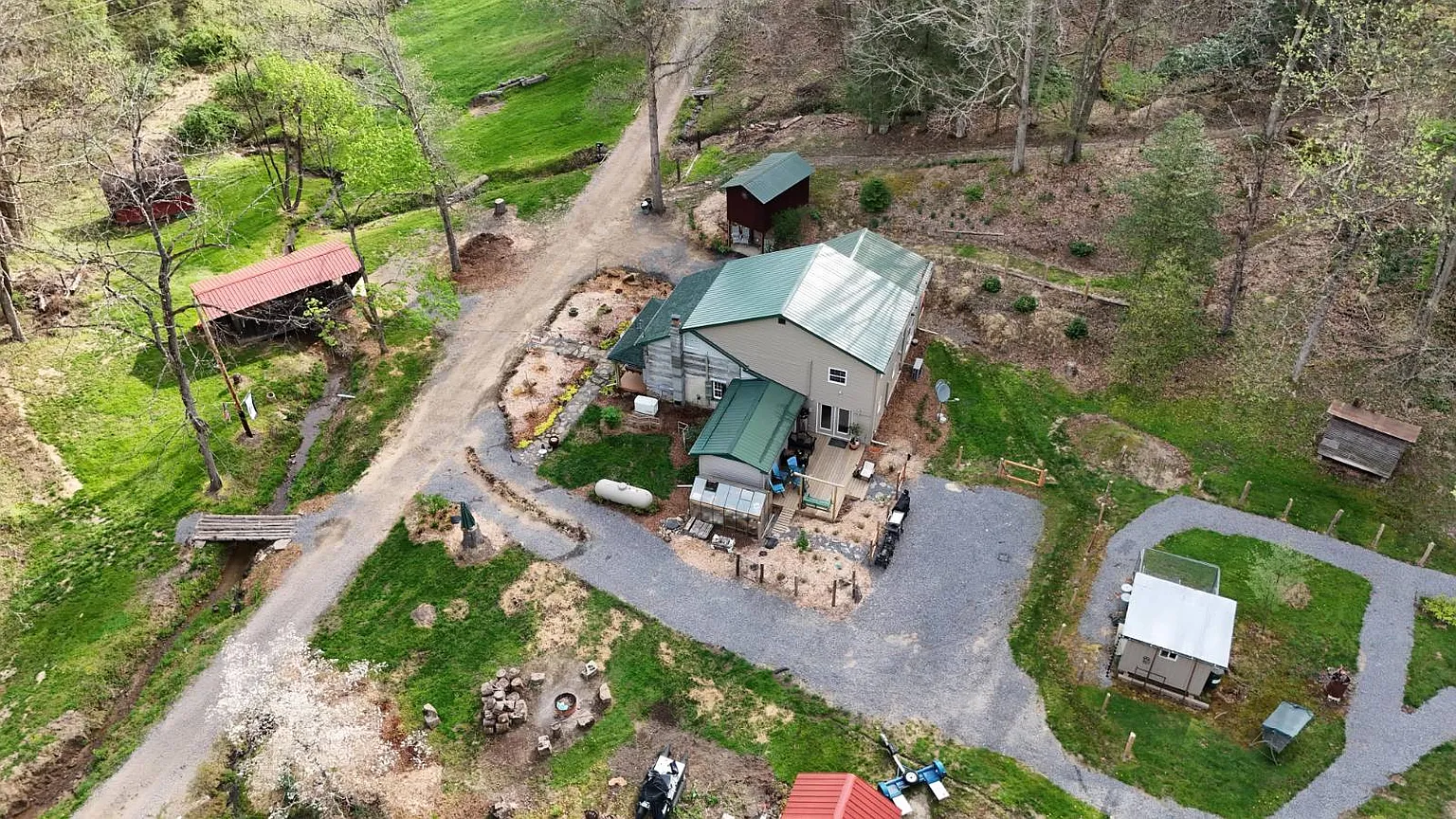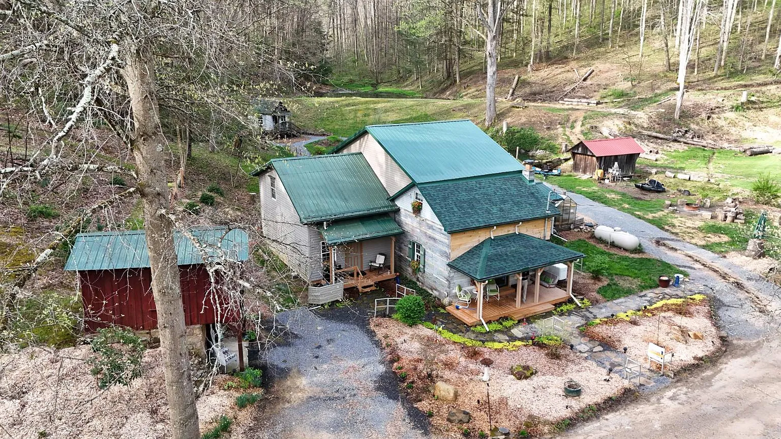 The 22.12 acres include a stocked pond on the property. You can sit on one of the two covered front porches and look out over the land. Several outbuildings come with the place including a chicken house and a playhouse. Covered bridges provide additional storage space. The two-story cellar house adds more room for tools or supplies. The acreage gives you space to walk around or set up areas for hobbies. People often use land like this to raise a few animals or just enjoy the open ground.