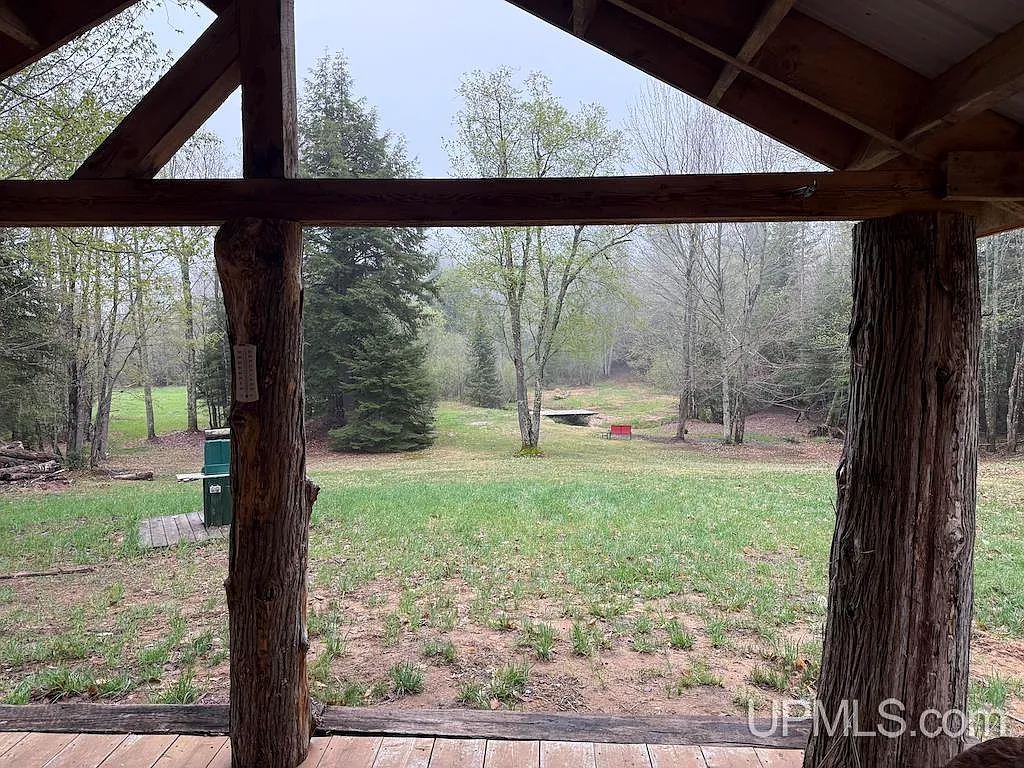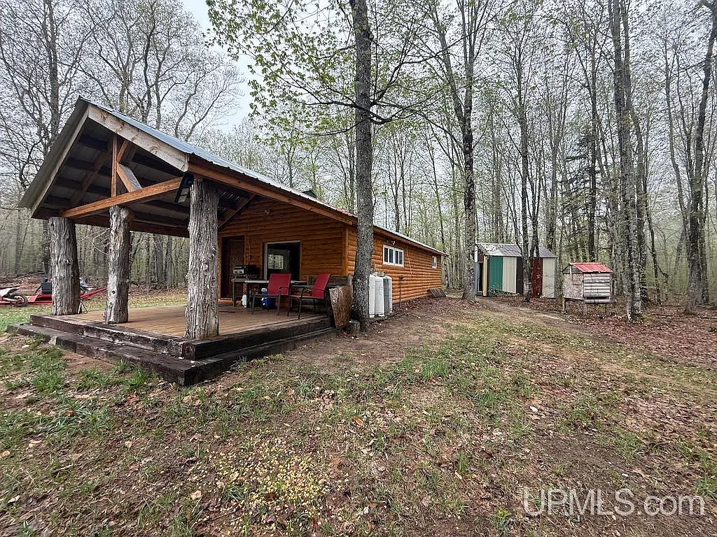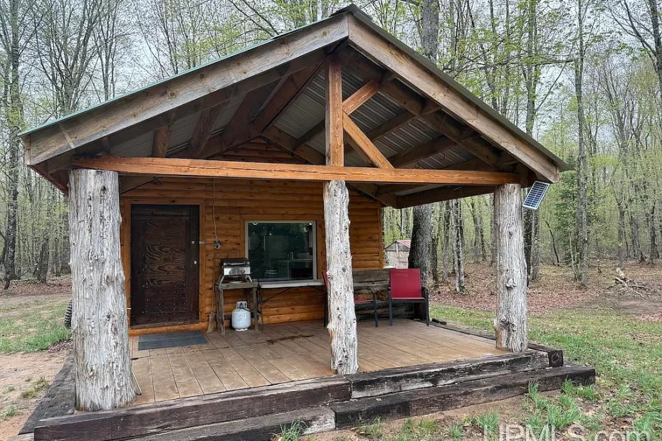 This log home sits on 80 acres in Grand Marais, Michigan. Built in 1981, the single-level cabin measures 576 square feet with 1 bedroom and 0 bathrooms. It includes a porch and sits along Klondike Creek with 15 feet of frontage. The property features groomed trails and a large cleared area. Many people look at acreage properties like this when they want a remote getaway with basic comforts and direct access to woods and water in Michigan’s Upper Peninsula.