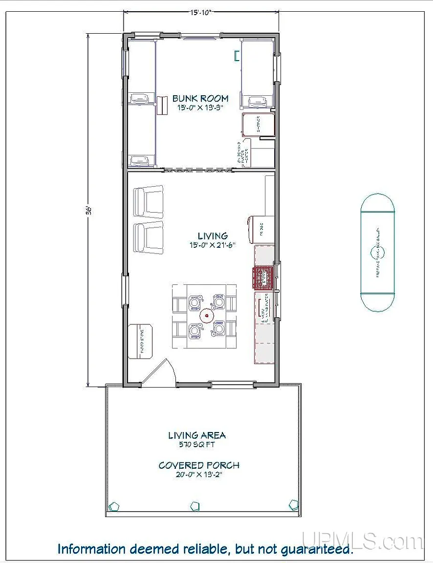 The main space combines living and sleeping areas in one open 21 by 15 foot living room and a 13 by 15 foot bedroom. Linoleum flooring covers the surfaces. Appliances include a range, oven, and refrigerator. The 576 square feet keeps everything compact for short or seasonal stays. You could add partitions if you want more separation or keep the open feel for flexibility. The wood cookstove and propane heater handle warmth, while window units cool things in summer. The shower and hot water on demand add daily convenience.