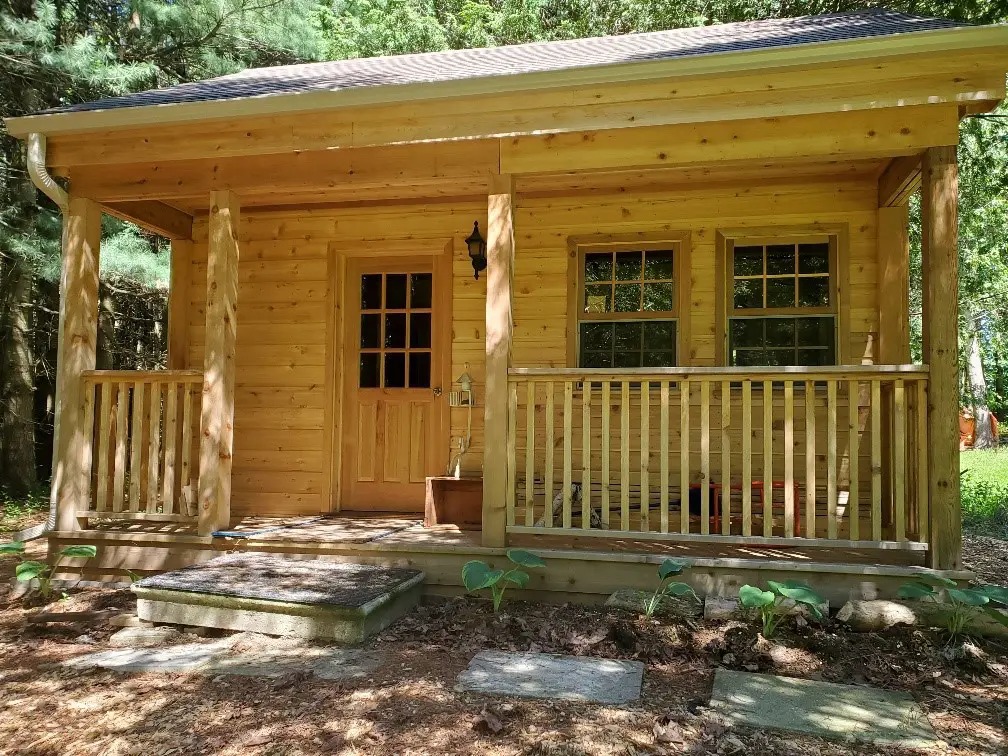 This cabin fits in the woods, by a lake, on a ridge, or in a big backyard. The deep porch roof adds character and improves comfort. It also creates useful loft space. The 8-foot sidewalls add headroom, so the cabin feels open.