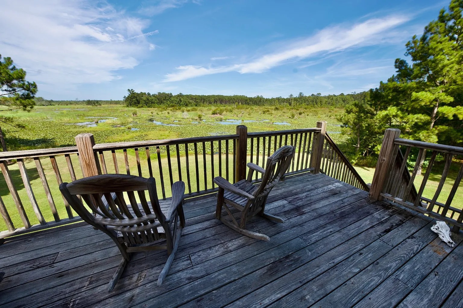 The upper-level porch overlooks nearly 60 acres of water, offering a quiet place to rest after a morning hunt or enjoy a sunset in the evening. It’s a space designed for both work and relaxation.
